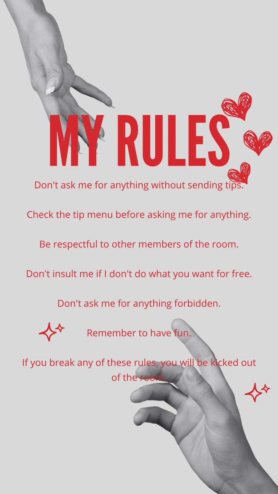 도기 스타일, 스팽킹, 에로틱 댄스, 음란한 대화, 트월킹, 핑거링, 스트립쇼, 페이스씨팅, 풋 페티시, 자위행위 지침, 핸드잡, 상의탈의, 젖소, 오일 쇼, 하드코어, 오르가즘, 젖치기, 자위, 블로우잡, 굴욕, 딜도 또는 바이브레이터, 자지 평점